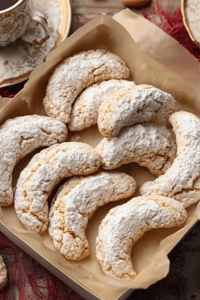 Almond Crescent Cookies store surprisingly well. In an airtight container at room temperature, they’ll stay fresh for up to a week. To freeze, place them in a single layer on a baking sheet to harden, then transfer to a freezer bag. When you’re ready to enjoy, let them thaw and re-dust with powdered sugar for that fresh-baked look.