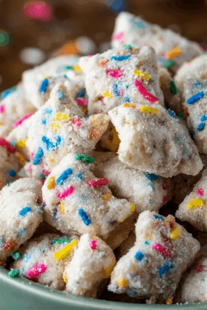 Absolutely! While traditional Cake Batter Puppy Chow uses vanilla or funfetti cake mix for that classic birthday flavor, chocolate cake mix creates a rich, brownie-like twist. Just make sure it’s heat-treated before using.