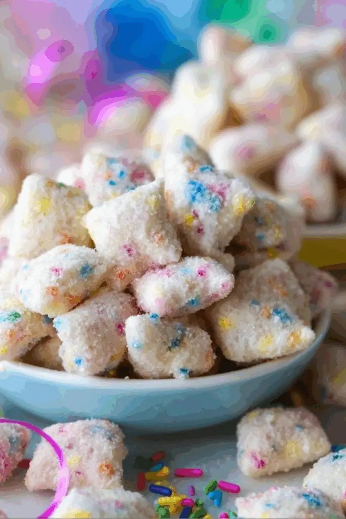 Once made, store Cake Batter Puppy Chow in an airtight container. It stays fresh at room temperature for up to a week, but for longer storage, keep it in the fridge. The powdered sugar layer helps lock in crispiness, but avoid humid environments that could cause clumping.