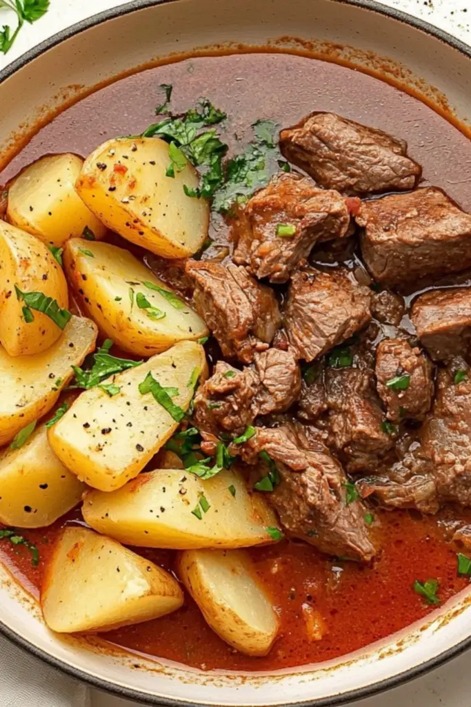 By choosing either chicken or beef, you can tailor this recipe to your personal tastes or the ingredients you have on hand. Both options result in a stew that’s tender, flavorful, and deeply satisfying. The tomato-based sauce, infused with garlic, onion, and a hint of spice, is a true star, perfectly complementing the richness of the meat and the heartiness of the potatoes.