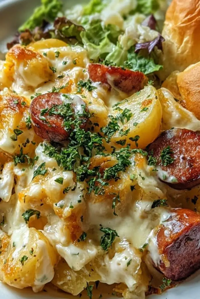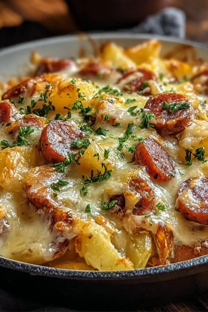 Cheesy Ranch Potatoes and Smoked Sausage is a hearty comfort dish combining tender potatoes, smoky sausage, and melted cheese with ranch seasoning.