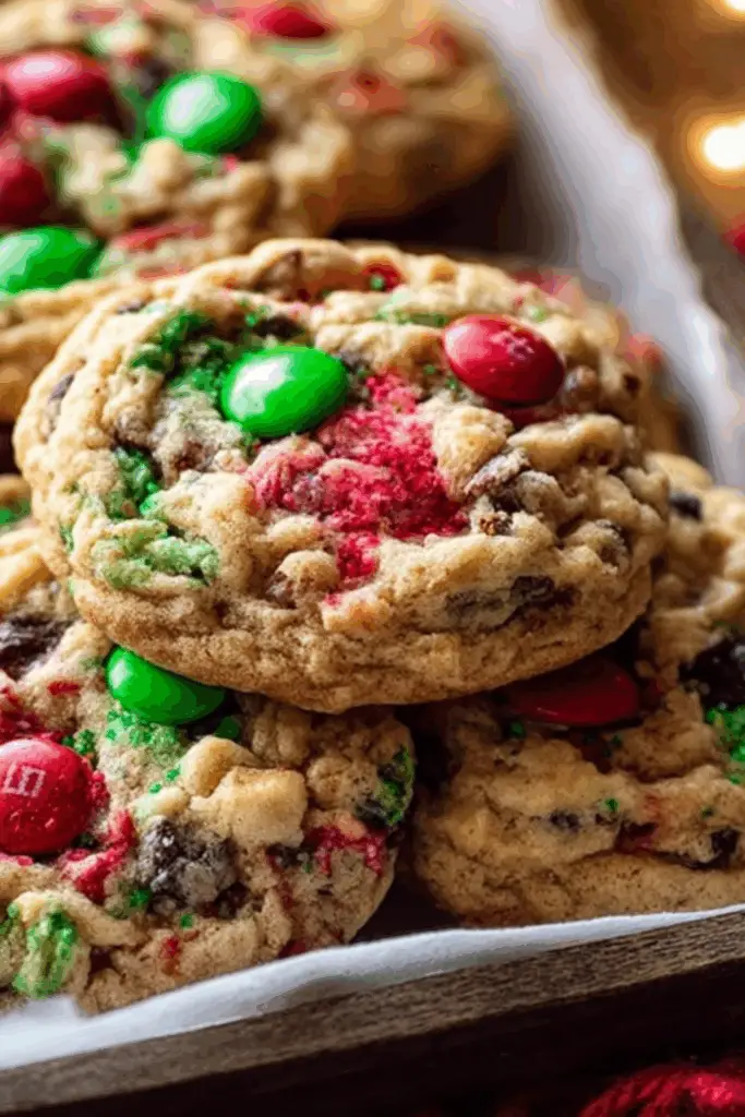 These cookies are chunky, chewy, and loaded with festive flair. The base is rich with peanut butter and oats, and each bite is packed with red and green M&Ms, chocolate chips, and sometimes even crushed peppermint or sprinkles. They’re essentially the over-the-top holiday version of classic monster cookies, and they do exactly what holiday desserts should: make you smile.