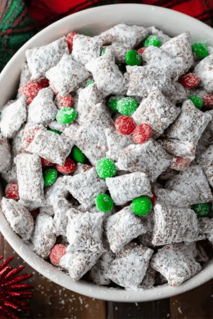 Christmas Puppy Chow, also known as Muddy Buddies, is a festive twist on the classic cereal snack mix. Typically made with Chex cereal coated in melted chocolate and peanut butter, it gets a powdered sugar snowfall to finish it off. The holiday version amps it up with red and green M&Ms, sprinkles, and sometimes peppermint or white chocolate. It’s sweet, crunchy, salty, and oh-so-satisfying.