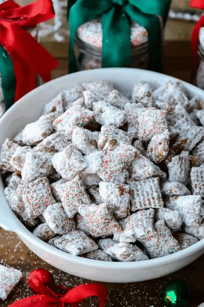 This Christmas Puppy Chow is a festive twist on the classic snack mix, coated in chocolate, peanut butter, and powdered sugar, with a cheerful holiday flair.