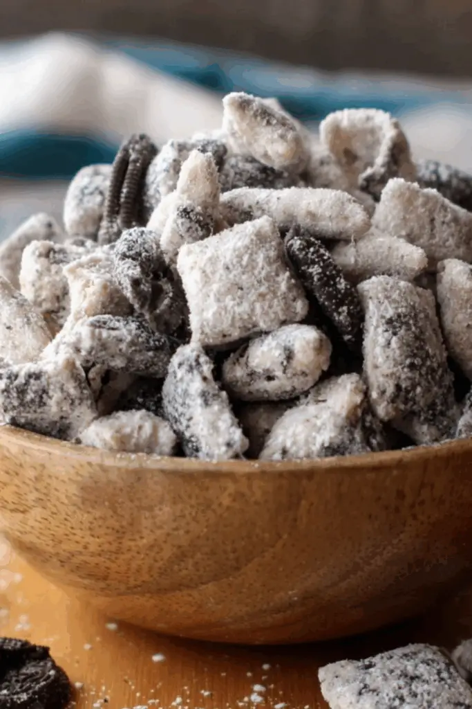 Stored in an airtight container at room temperature, Cookies and Cream Puppy Chow stays fresh for up to 7 days. For longer storage, you can freeze it and thaw before serving.