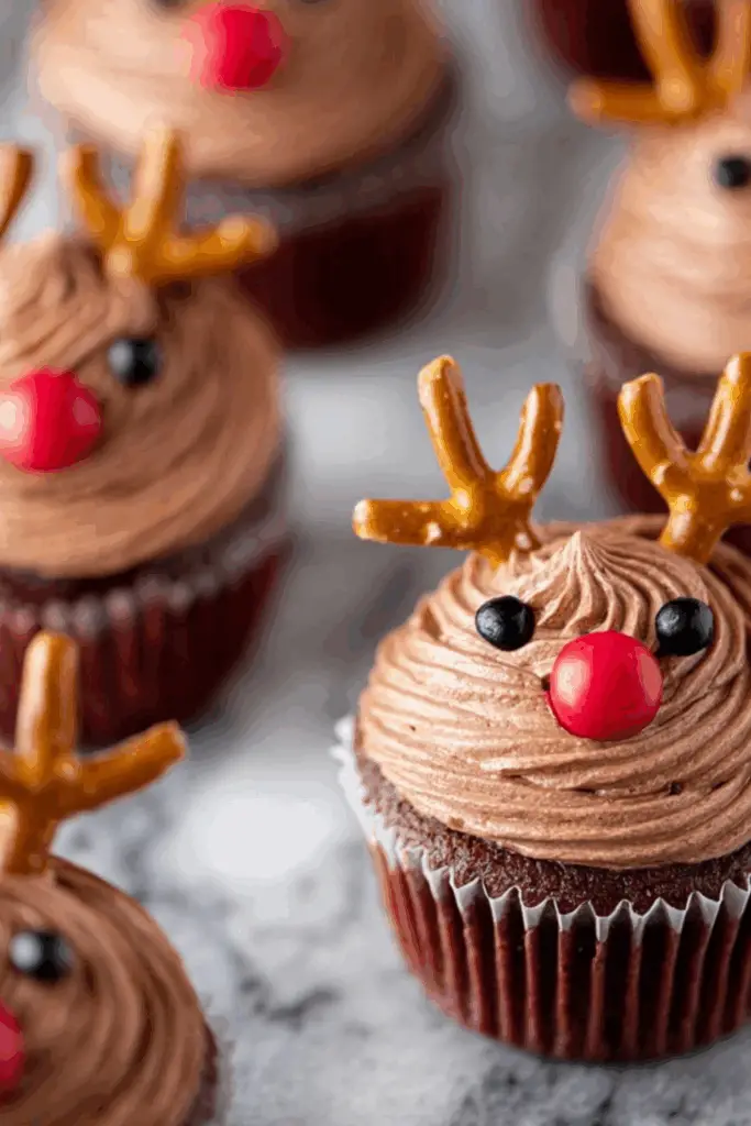Now comes the fun part—turning plain cupcakes into festive reindeer. Start by piping a generous swirl of frosting on each cupcake. Place two mini pretzels on top for the antlers, add candy eyes, and press one red candy into the center for the nose. If you’re making a mix, use brown candies for regular reindeer and one red for Rudolph.