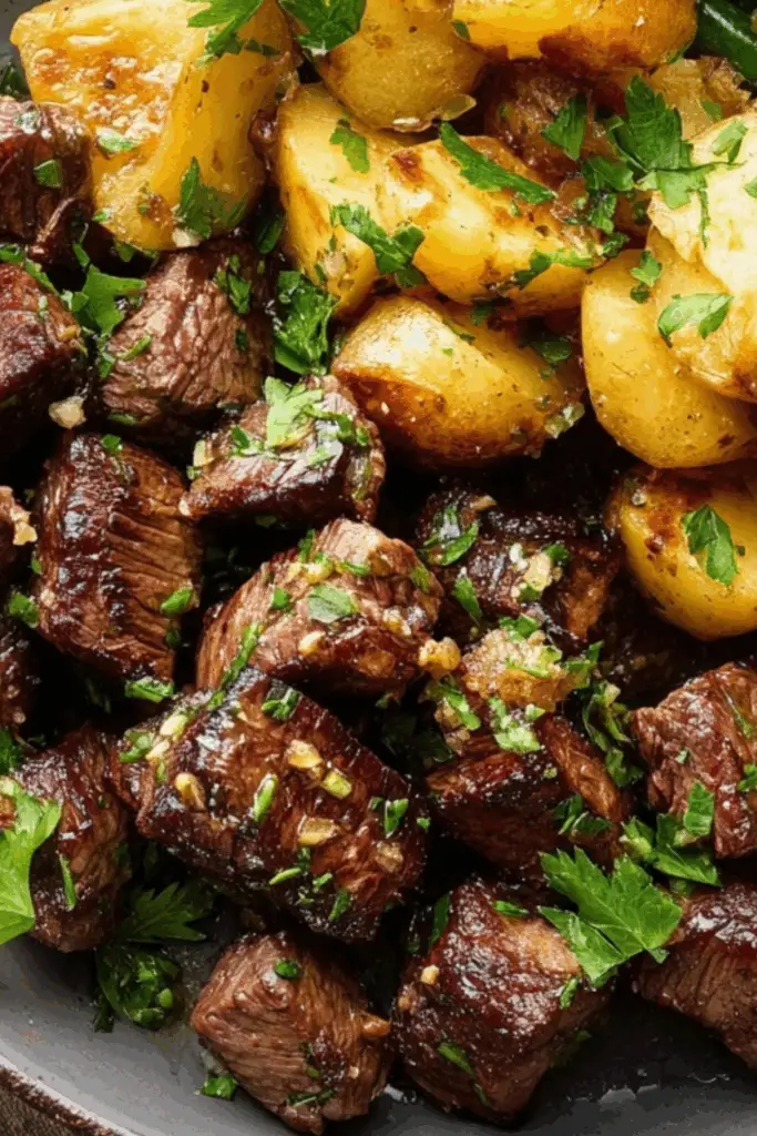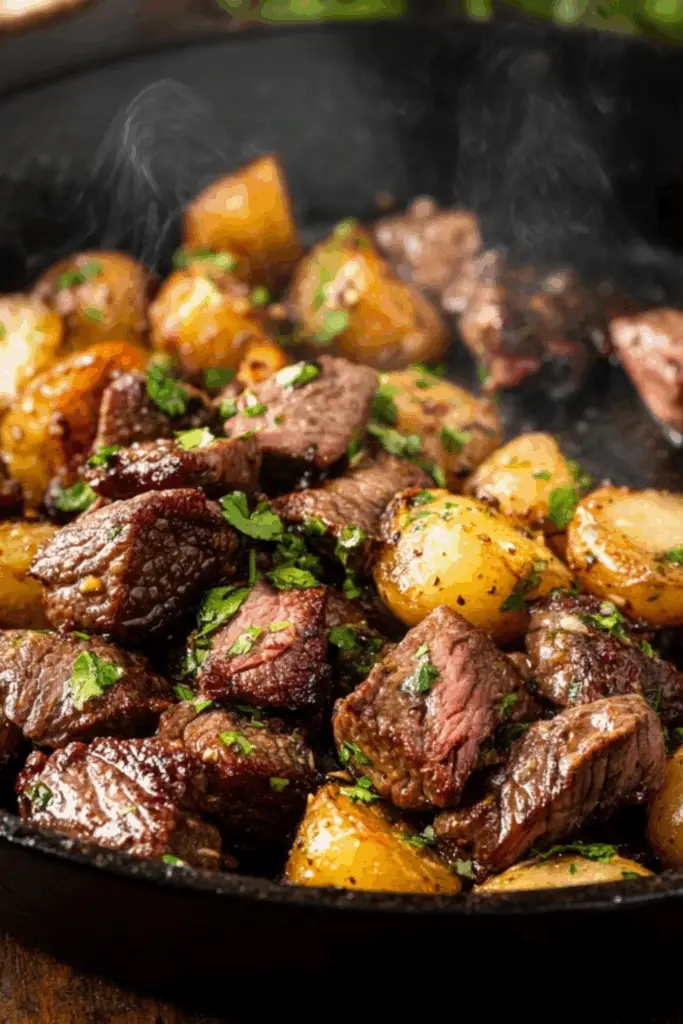 Juicy, tender steak bites seared to perfection with golden, crispy potatoes, all tossed in a rich garlic butter sauce. A quick, one-pan dinner that’s bursting with flavor and ready in under 30 minutes.