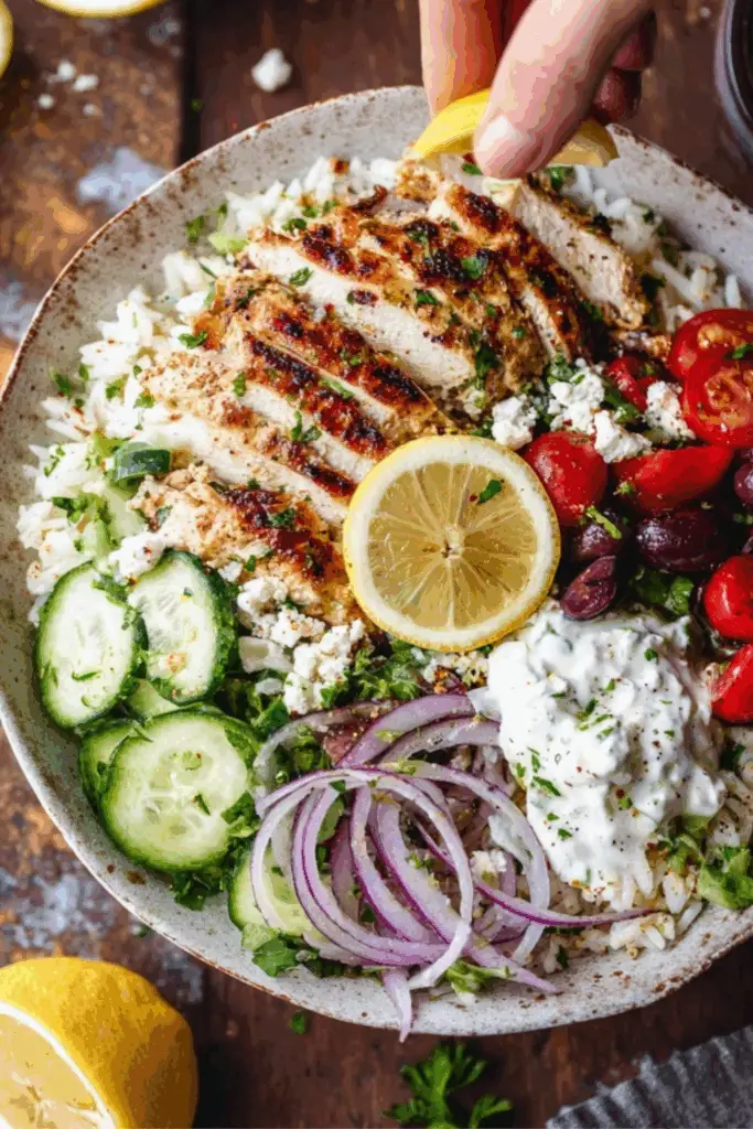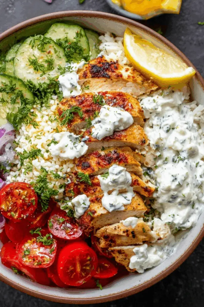 A flavorful and healthy Greek Chicken Bowl packed with juicy grilled chicken, Mediterranean toppings, and creamy tzatziki sauce.