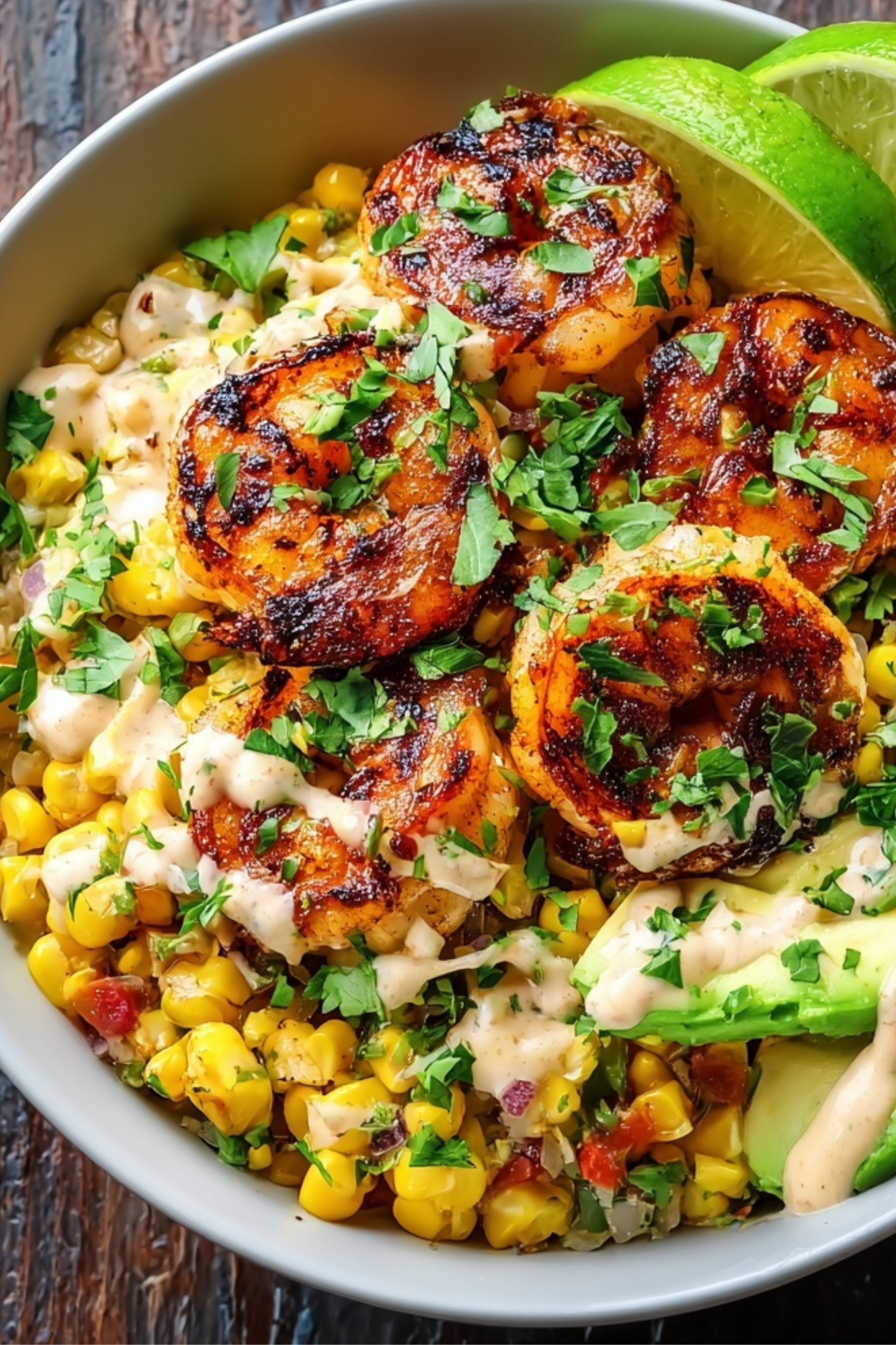 The corn salsa is a key player in the Grilled Shrimp Bowl with Avocado, Corn Salsa & Creamy Sauce. Fresh corn kernels—charred for extra flavor—get tossed with diced tomatoes, red onions, jalapeños, cilantro, lime juice, and a hint of salt. It’s bright, refreshing, and a perfect contrast to the savory shrimp. For variety, you can pull inspiration from easy corn salsa chipotle copycat or add a creamy twist from Mexican street corn salad.