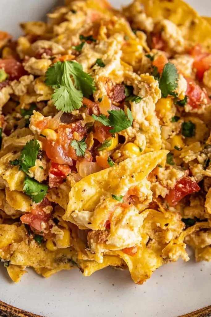 Pour the whisked eggs into the skillet, stirring gently to combine them with the tortillas and vegetables. Cook the eggs for 2–3 minutes, or until they’re set but still soft.Pro Tip: To avoid overcooking, remove the skillet from the heat just before the eggs are fully done. They’ll finish cooking in the residual heat. - Finish and Serve