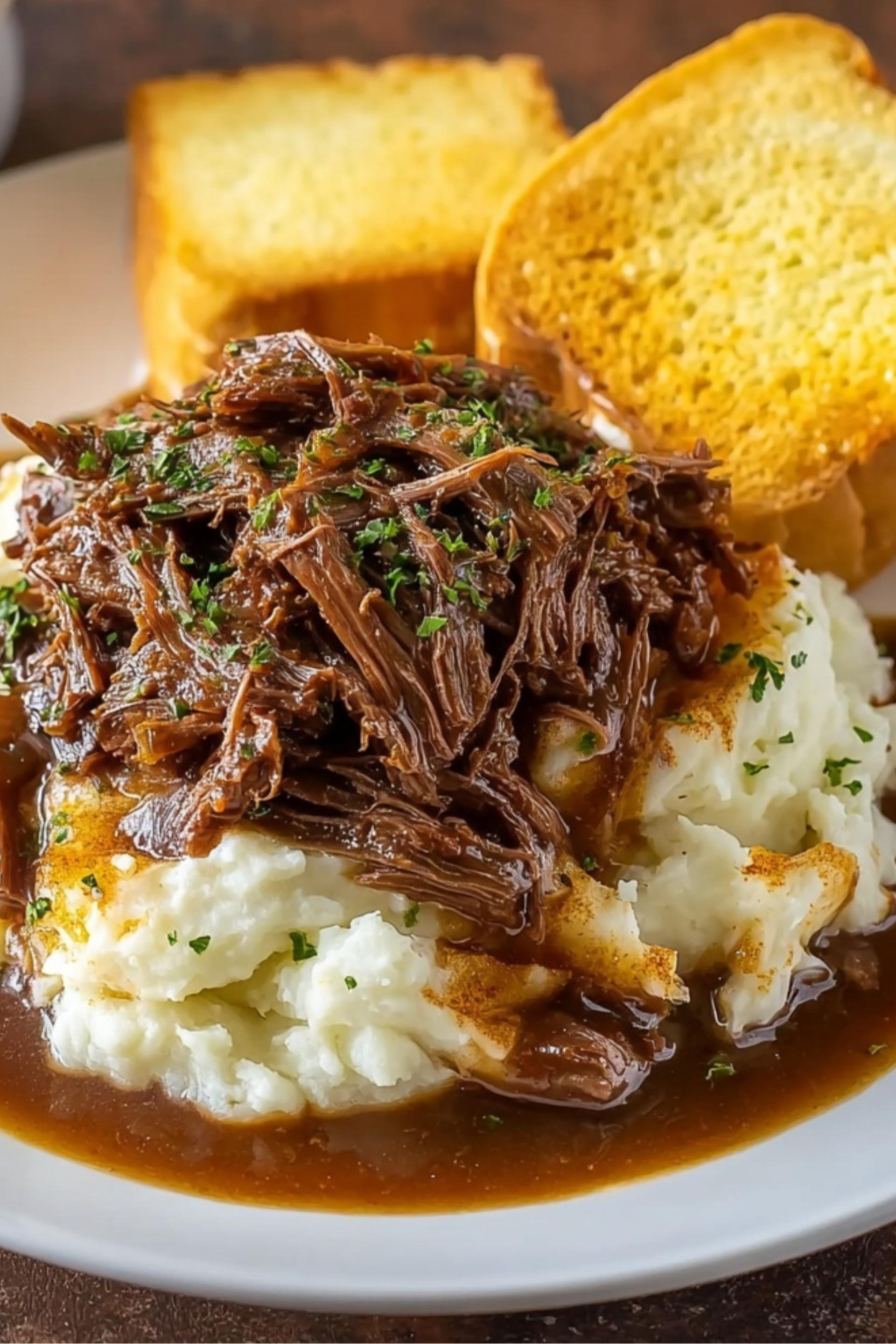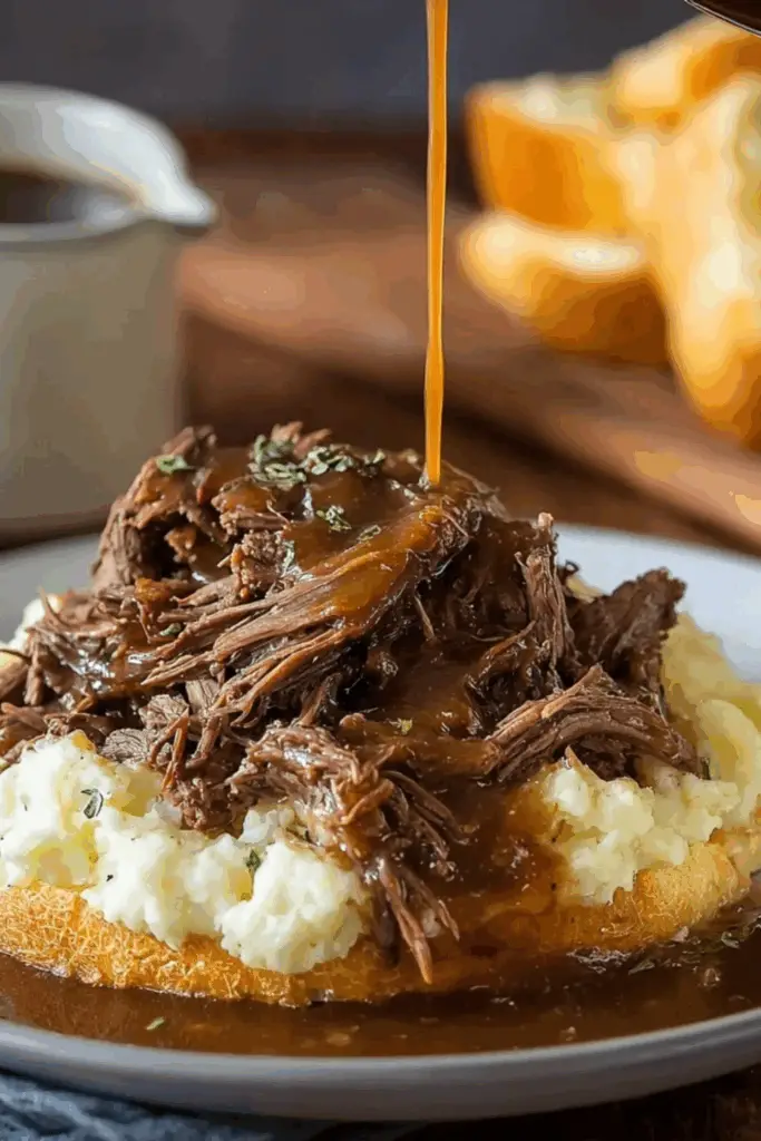 - To serve: place slice of bread on plate, scoop mashed potatoes on top, pile with shredded beef, then ladle gravy over all.