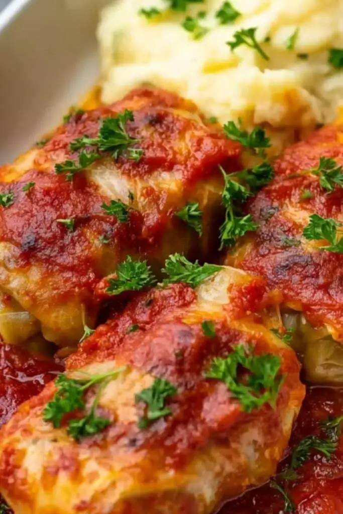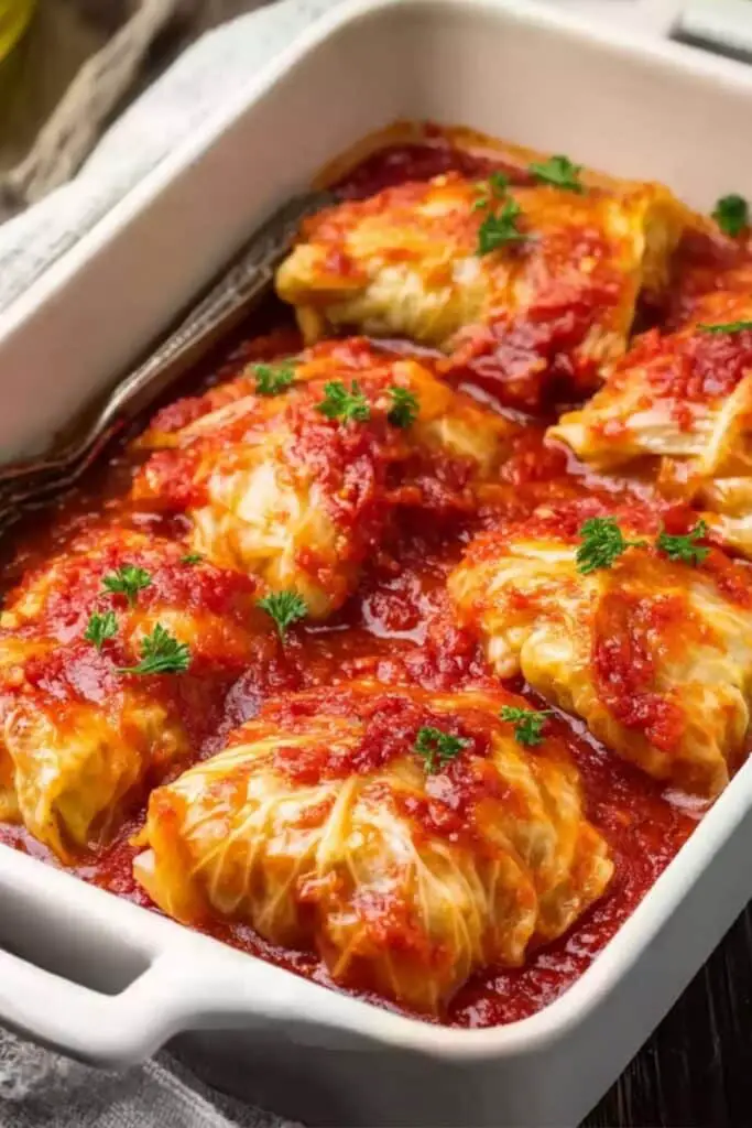 A comforting classic, Stuffed Cabbage Rolls are made with seasoned meat, rice, and tender cabbage leaves, baked in rich tomato sauce.