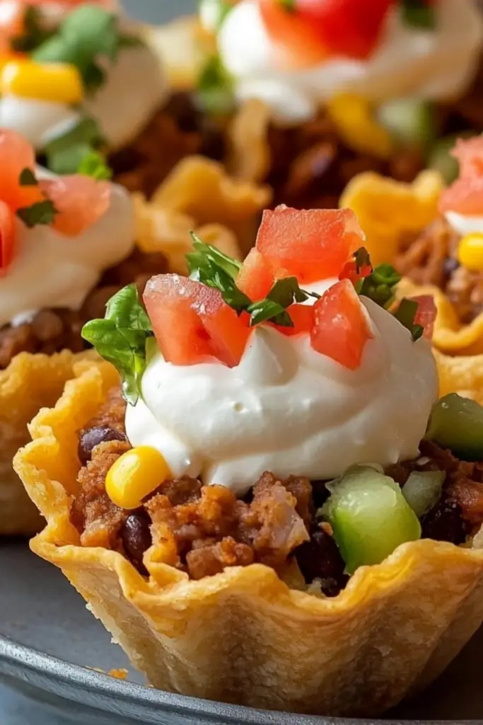Place a wonton wrapper into each muffin cup. Gently press it into the bottom and up the sides of the cup. This will form a bowl-like shape to hold the taco filling. - Layer the Taco Filling