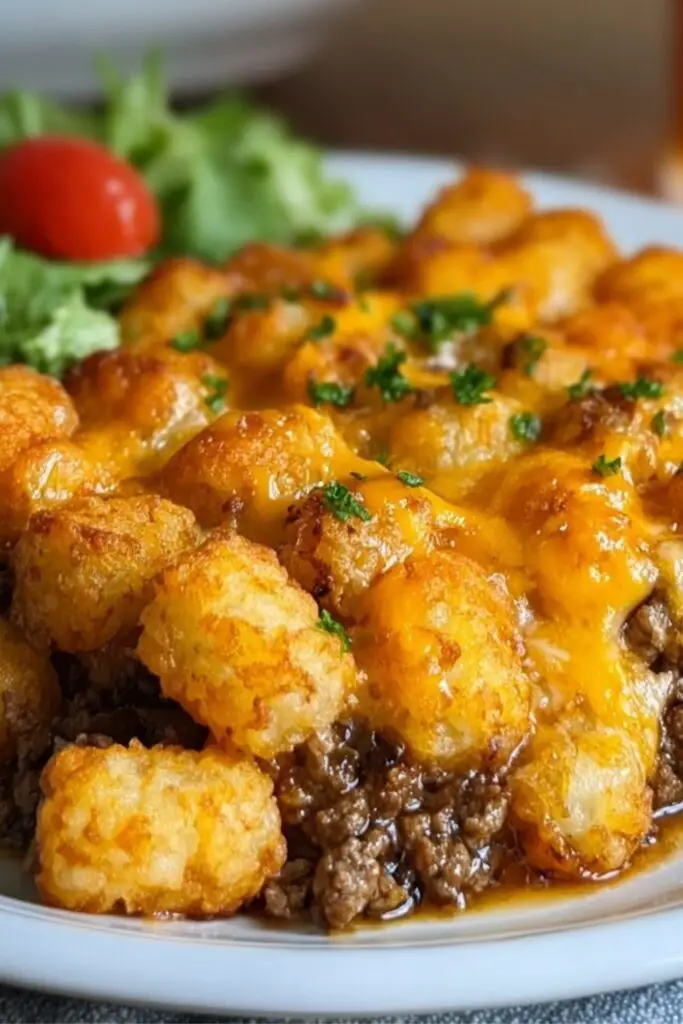 Tater Tot Casserole with Ground Beef is versatile. Serve it as a weeknight dinner, double it for a crowd, or prepare it ahead of time for busy days. Leftovers reheat beautifully, making it a meal-prep favorite. To keep it from getting soggy, store it in an airtight container and reheat in the oven for crispiness.
