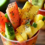 - Prepare the Fruit: Peel and slice the mangoes, papaya, cucumber, and watermelon into evenly sized pieces. Consistency in size makes the cups more visually appealing and easier to eat. Reserve any leftover chunks for layering at the bottom of the cups.