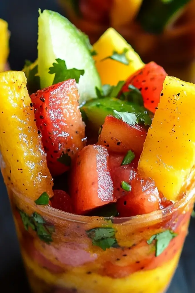 - Arrange the Fruit: Layer the fruit in the cups, alternating colors and textures for visual appeal. Top with a sprinkle of chili-lime seasoning, a slice of red chili pepper (if using), and a garnish of cilantro or mint.